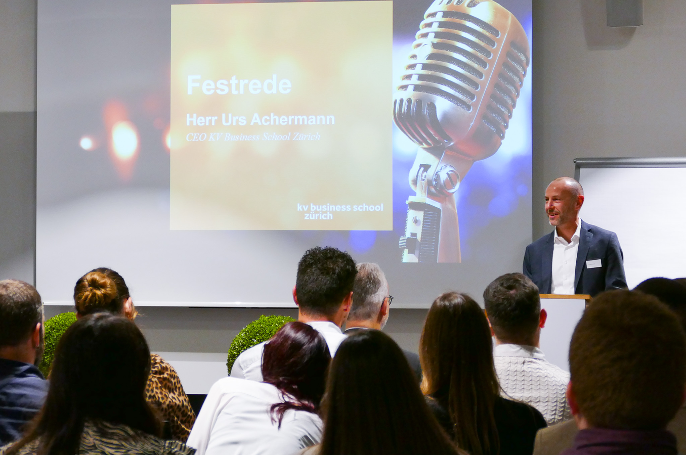 Die Lehrgangsleiterin Esther Rhiner und Urs Achermann, der CEO der KV Business School Zürich, begrüssten alle Gäste zur Abschlussfeier und dankte Ihnen für das uns entgegengebrachte Vertrauen. Sie freuten sich, dass alle so zahlreich erschienen sind und gratulierten zum tollen Abschluss.
